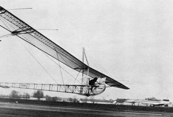 " The configuration was moved to Arlington airport where a hangar allowed partial assembly. A large unused runway was available for flight tests. This proved to be an ideal site for straight line flight. This aircraft became the first [of his] configurations to be pedalled off the ground without tow assistance, and several short flights of up to 100 yards (91 m)were achieved.