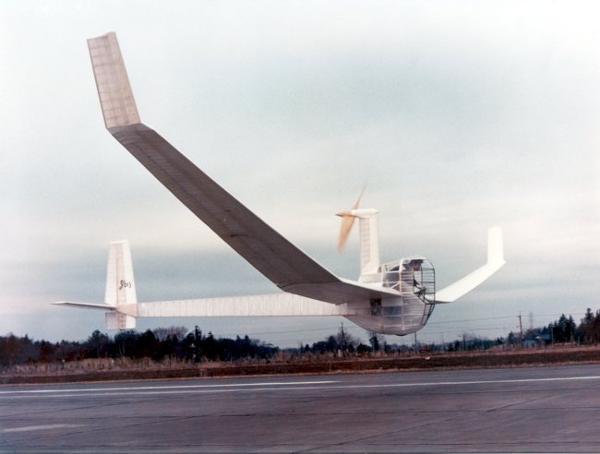 The Biplane Ultralight Research Device, was the first attempt at HPF by students at the Massachusetts Institute of Technology, Cambridge, MA, USA (MIT). They chose the configuration of a two-seater canard biplane, with the propeller mounted behind the fin. Span was 63 ft (19.2m) with a total wing area of 640 sq ft (59.5 m2) of FX61-163 section. Spoilers were incorporated for lateral control. Spar was laminated Balsa. Considerable structural analysis of many of the primary and secondary components of the BURD was performed by Paul Hooper and Robert Peterson. However the capability of the wing to resist being bent forward was neglected, with the result that the wings of this promising two-seat biplane collapsed forward during rotation on its first flight-attempt in 1972.