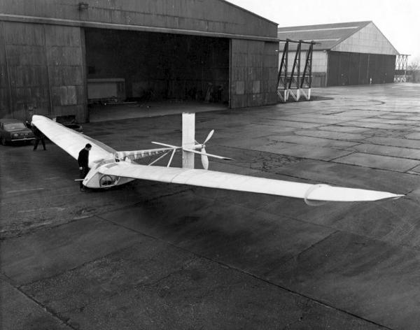 In the mid 1970s, when the first few British aircraft had flown but failed to win the figure-eight prize, people were looking for new approaches. Rear Admiral H C N Goodhart CB, a champion glider pilot with other aeronautical experience, had the idea of increasing the span without increasing the weight of the wing, by distributing the load along its span. In 1975 he designed the Newbury Manflier with two pilots seventy feet apart, each in their own fuselage. When the author saw this machine under construction, it looked to him like two Jupiters tip-to-tip, the wing having a span of 138 feet (42 m), an area of 198 square feet (18.4 m2) and a Wortmann aerofoil section.