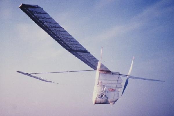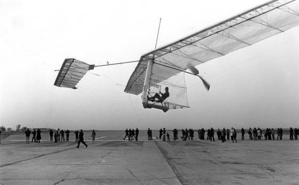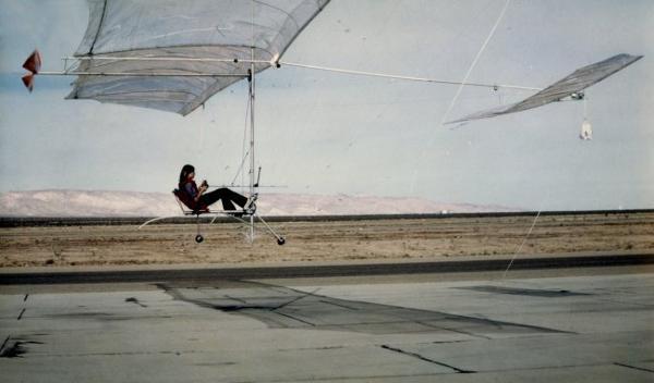 The first 40 second flight of the Mohave version of the Gossamer Condor, Dec 26, 1976, Parker MacCready pilot. RAeS collection