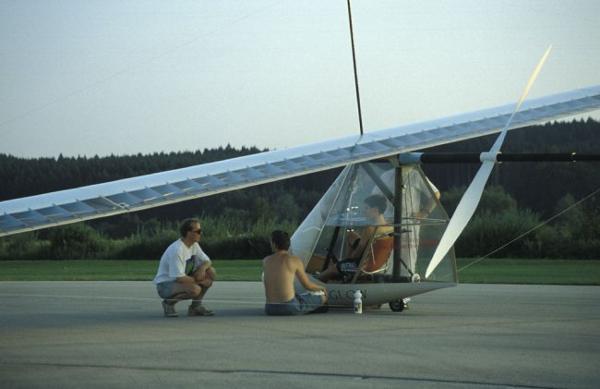 In June 1990, the McIntyres realised that in order to get flying in the foreseeable future, their policy of perfection in workmanship could be compromised, particularly on a part which could later be replaced by a better one. In any event they were obliged to follow this course with respect to the windscreen since the material they really wanted was not available. They wanted to use a large single sheet of Melinex, but the windscreen was made from joined sheets of acetate. The airframe was complete in July 1990, and tests were conducted to prove the control system which used a remote-control aircraft-model system except that instead of radio, the link between the pilot's control and the servos was by wires. The model servos proved satisfactory, and on one test were even able to provide a torque sufficient to overstress the control surface. This surface was replaced and calm weather was waited for. On 20th July 1990 Airglow was assembled at Duxford airfield Cambridgeshire, England early in the morning. Seventeen year old Nick Weston was in the hot seat and for the first time an attempt was made to fly the plane. On the first run, quite a lot of the runway was covered at what seemed to be surely sufficient speed, but on the runway was where the plane stayed. An adjustment was made to the elevator setting and on the second run Airglow made its first flight at 6 am. Three further flights were made, the longest being about a quarter of a mile.